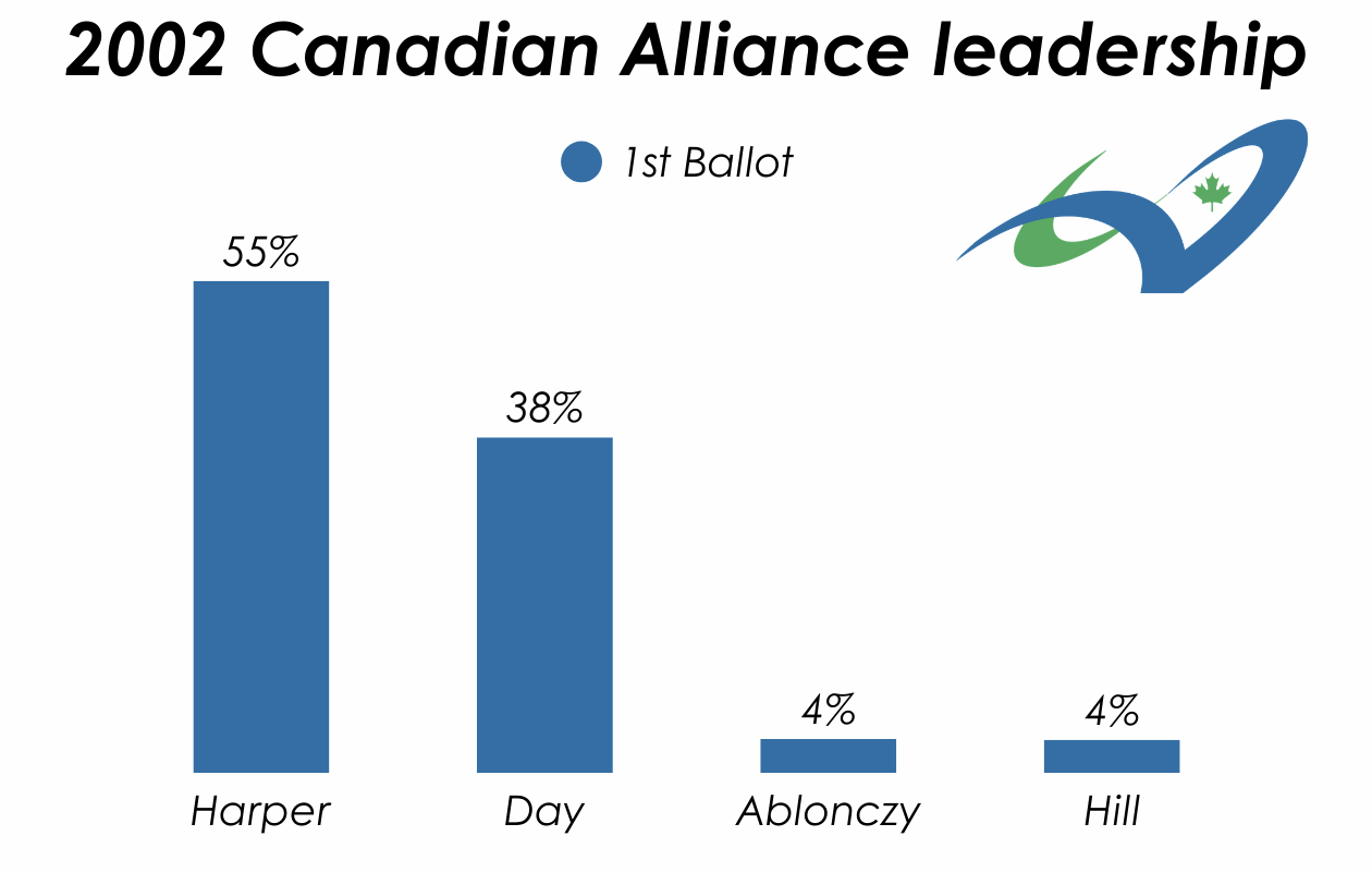 Seen as a good communicator, a fiscal conservative and someone who could expand the party’s appeal beyond it’s Western, social-conservative base, Harper became the main challenger to Day’s leadership. Much of the pre-existing base of Alliance members backed him, and by the end of the leadership campaign so did about half of the Alliance’s remaining MPs.