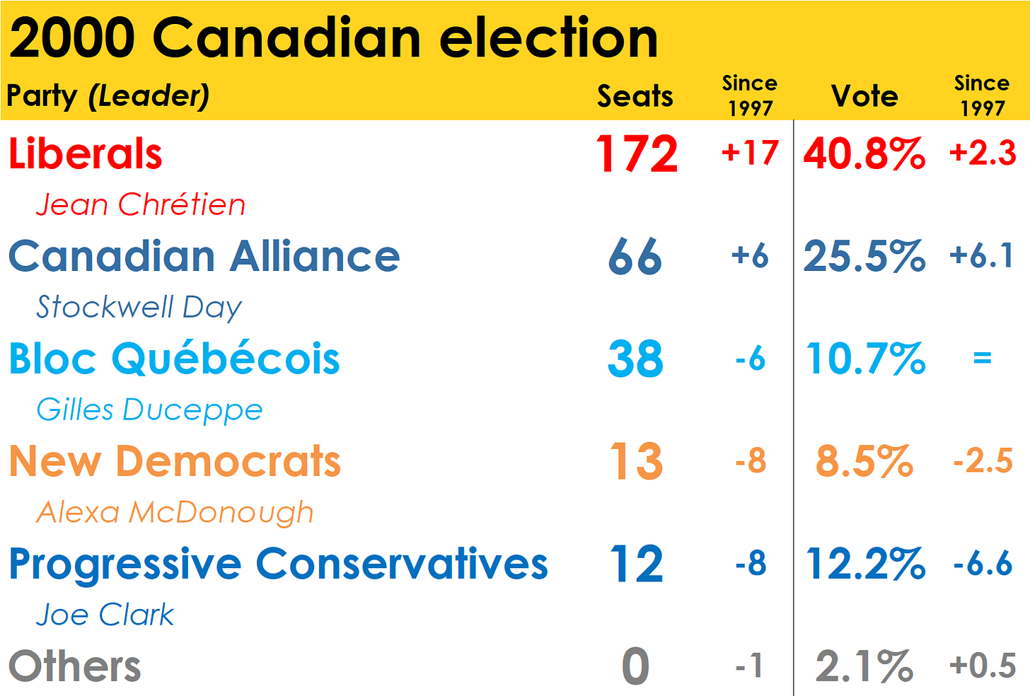 The Canadian Alliance won only 66 seats, just six more than Reform had won in 1997. The party dominated Alberta and won nearly half of the vote in B.C. and Saskatchewan, but secured just two seats and 23.6% of the vote in Ontario. Once again, Ontario formed a brick wall to the party’s ambitions. Despite speaking some French, Day made no inroads in Quebec and the PCs, rather than the Alliance, placed second to the Liberals throughout Atlantic Canada, winning nine of their 12 seats in the region.