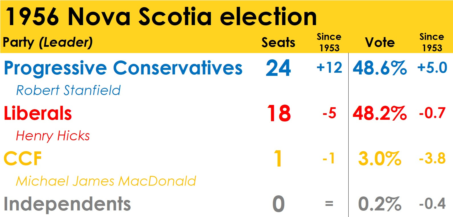 By 1956, the Nova Scotia Liberals had governed the province for eight of the previous 74 years and had been in power for 23 years straight, nearly all of that under Premier Angus L. Macdonald.