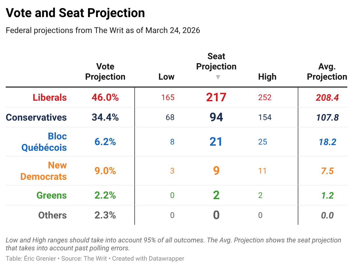 The Liberals are holding their wide advantage over the Conservatives in The Writ’s latest update and are projected to win 46% of the vote if an election were held today, putting them nearly 12 points ahead of the Conservatives.