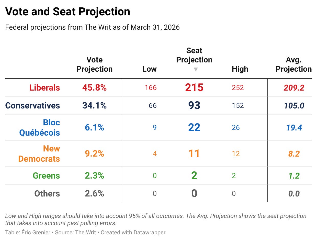 This week’s update to The Writ’s federal projection suggests the Liberals might have reached their plateau.