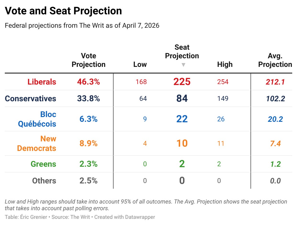 In the vote projection, the Liberals have ticked up 0.5 points to 46.3%, followed by the Conservatives at 33.8% (-0.3) and the New Democrats at 8.9% (-0.3).