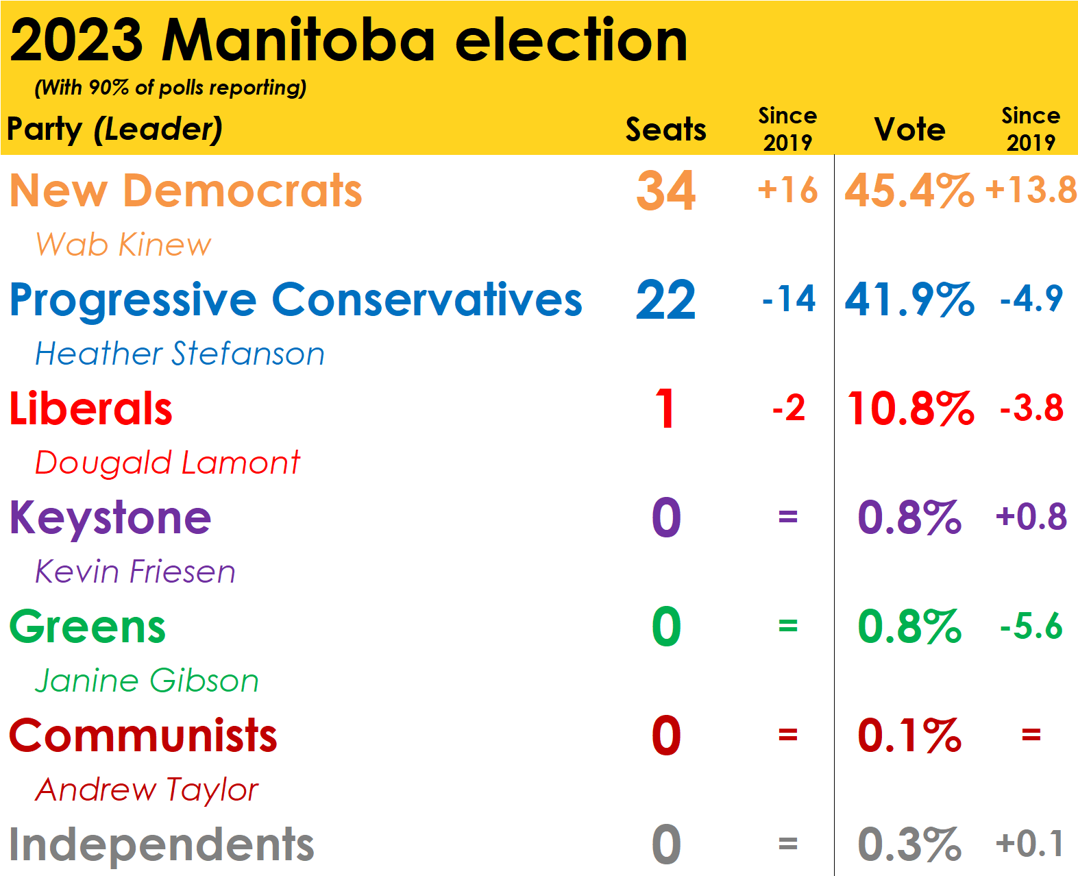 Elections Manitoba was slow in the counting, so I am writing this when there are only incomplete results some four hours after the polls close.