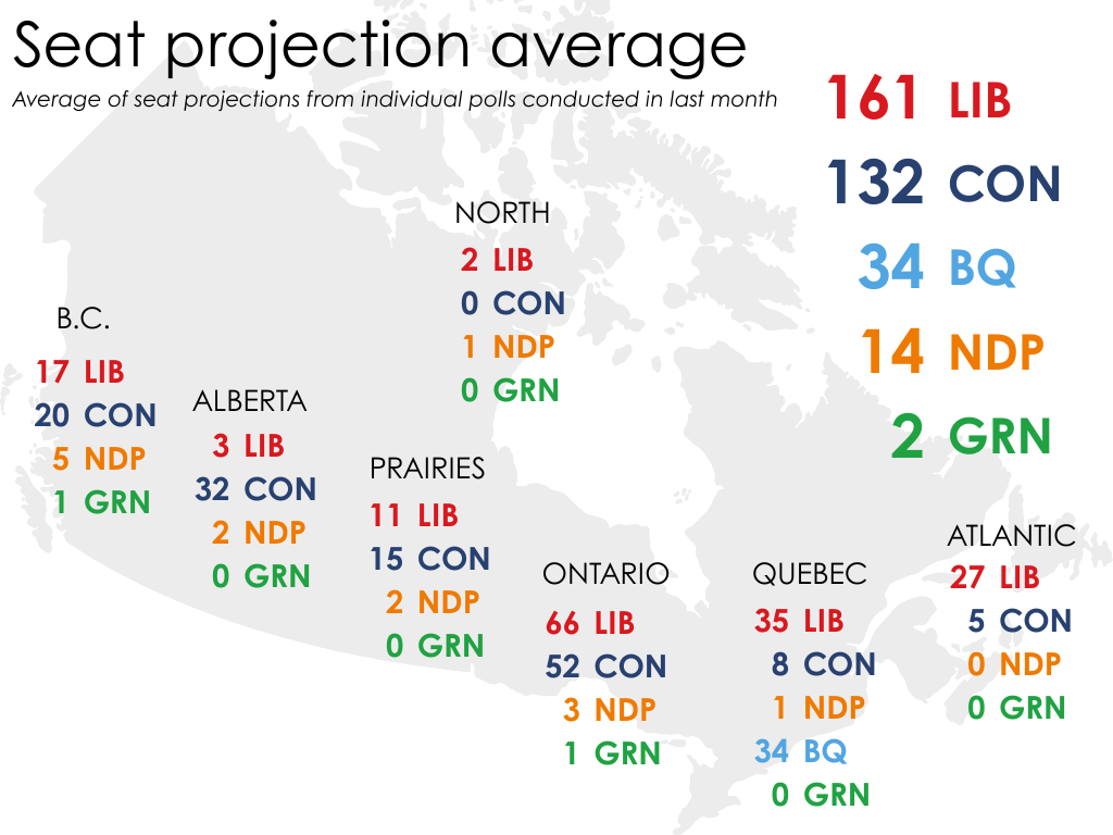 As a result of this shift, the Liberals are projected to win 35 seats in the province, with the Bloc taking 34 and the Conservatives being reduced to just eight.