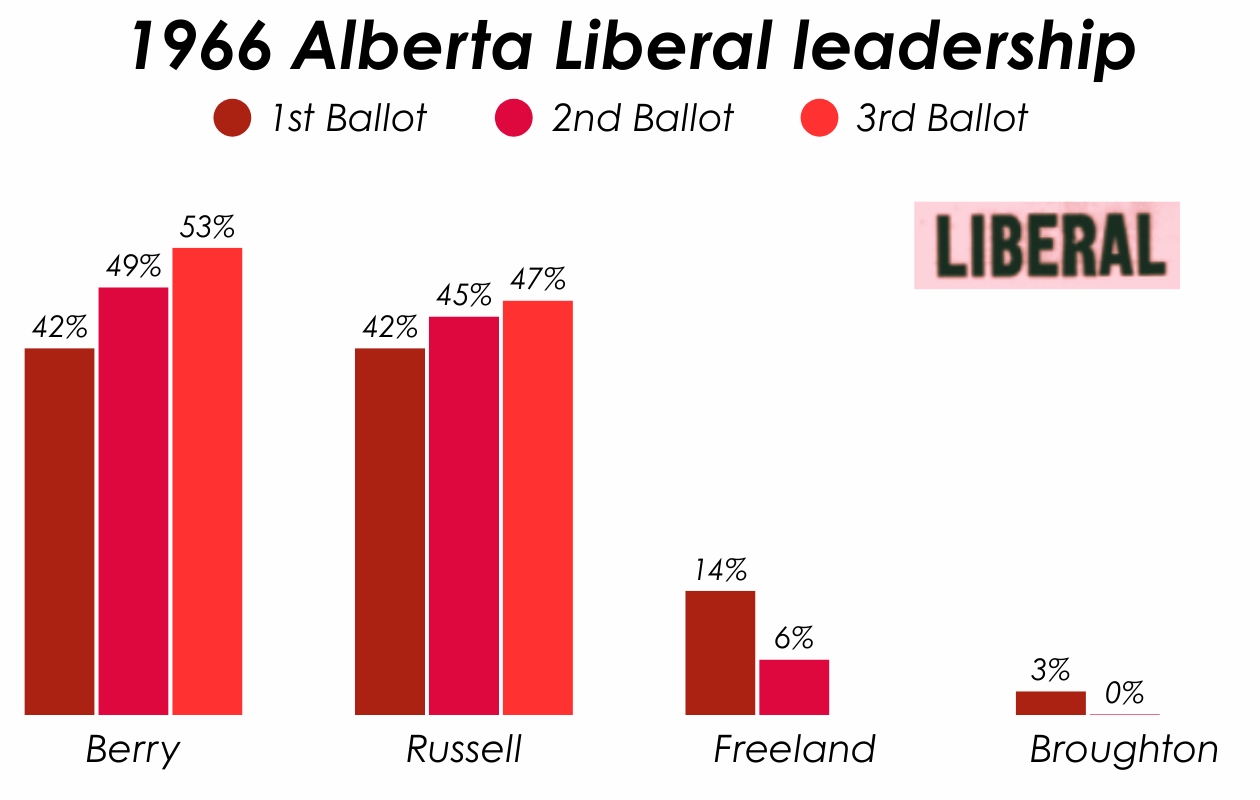 The first ballot ended in a tie, with both Berry and Russell taking 231 votes, each heavily backed by their respective Calgary and Edmonton bases. Freeland took just 78 votes, while Broughton had only 15.