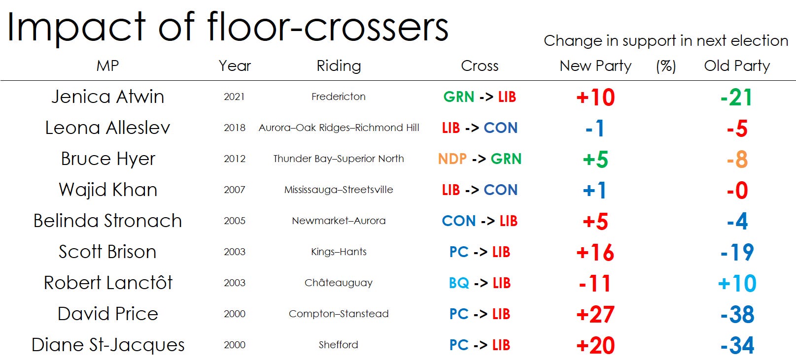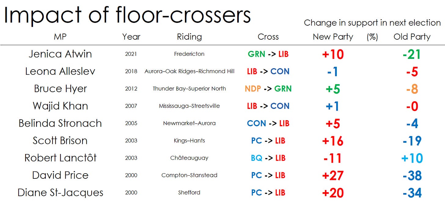 Of the nine in this list (I excluded floor-crossers who sat as an Independent at some point or those who didn’t run again), seven of them helped boost their new party’s vote share in the subsequent election. In eight of nine cases, their old party lost vote share. The one big exception on this list is Robert Lanctôt, who crossed from the Bloc to the Liberals — an ideological shift from sovereignist to federalist that many voters might not have been able to follow.
