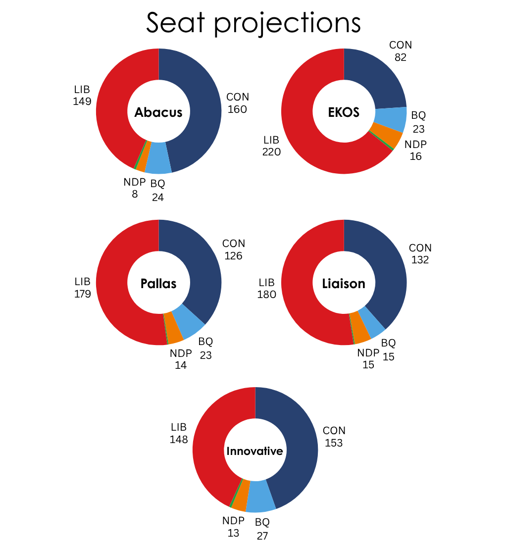 The electoral implications of these different numbers can be significant, a reminder that even small changes in the vote can cause big seat swings. These polls would produce everything from a Liberal landslide (EKOS) to a small Liberal majority (Pallas and Liaison) to a narrow Conservative minority (Abacus and Innovative).