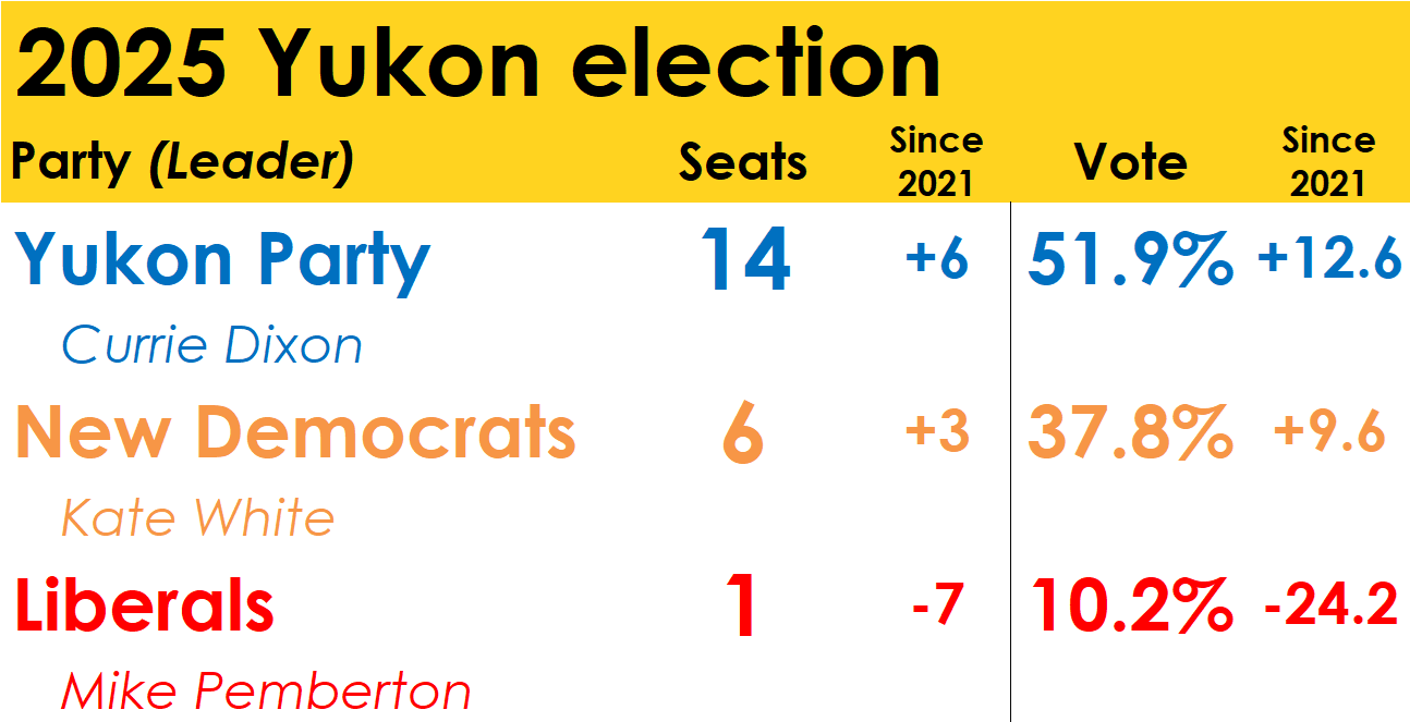 While a stinging defeat for the Liberals, this was a long time coming. The Liberals lost the popular vote to the Yukon Party by seven points in 2021 and only one incumbent stood for re-election in 2025. The result is the worst for the party since 1985, while this marks the first time the Yukon Party (or its PC predecessor) has captured more than 50% of the vote.