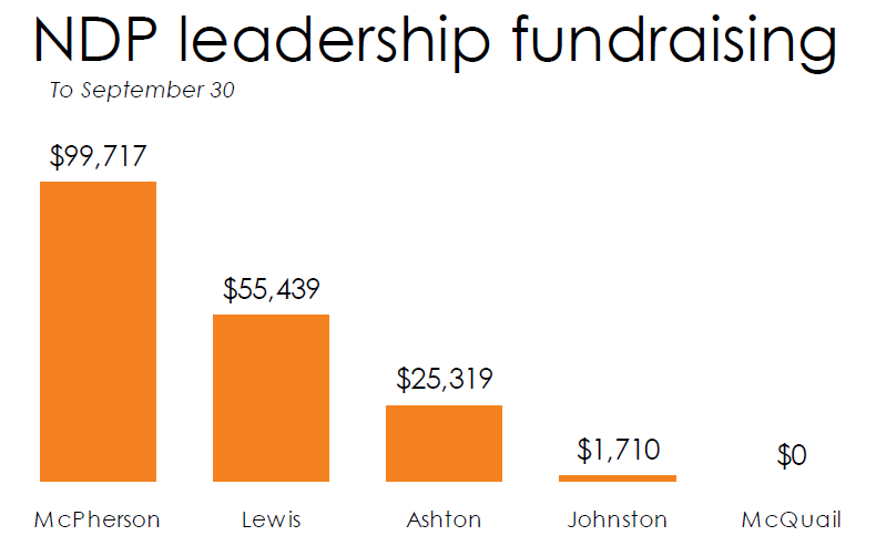 McPherson reported $99,717 in fundraising, representing 55% of the $182,000 that were donated to all leadership contestants. Avi Lewis placed second with $55,439 (or 30%), followed by Rob Ashton with $25,319 (14%) and Tanille Johnston with $1,710. No fundraising for Tony McQuail was reported (he was approved as candidate after September 30).