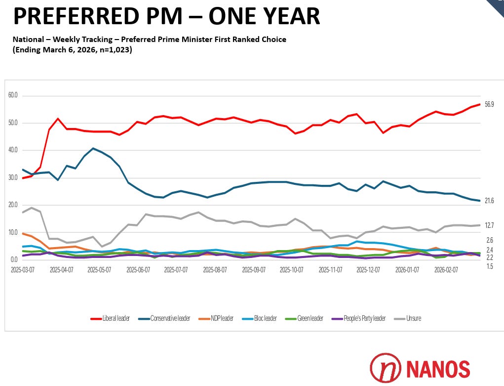 The last iteration of Nanos’s four-week rolling poll now has Carney at 57% on preferred prime minister, the highest it has ever been and higher even than Trudeau managed in his post-2015 honeymoon. Poilievre has now dropped to 22%. The gap between them is 35 points, wider than it’s ever been and wider than the advantage Poilievre ever enjoyed over Trudeau.