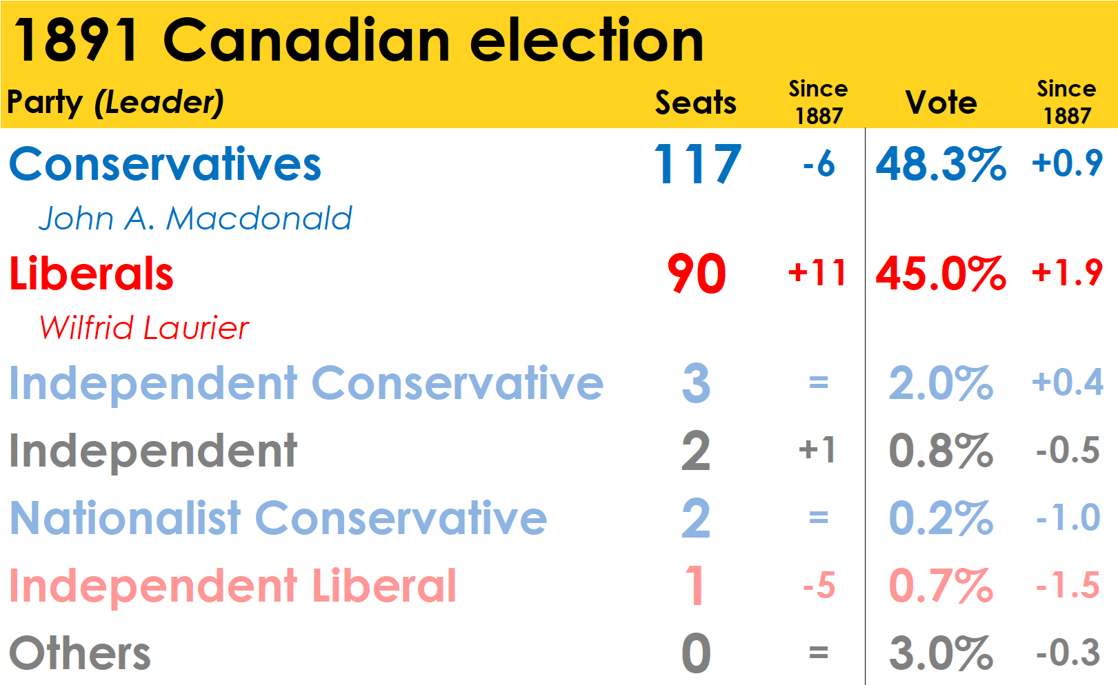 As the Dominion of Canada approached the 20th century, its prime minister was still a figure who was very much of the 19th. John A. Macdonald was Canada’s first prime minister and by 1891 had served in that role for all but five years since the country’s foundation. Since returning to office after the 1878 election, Macdonald had led his Conservatives (also known as Liberal-Conservatives) to victories in 1882 and 1887, defeating the Liberals under Edward Blake.