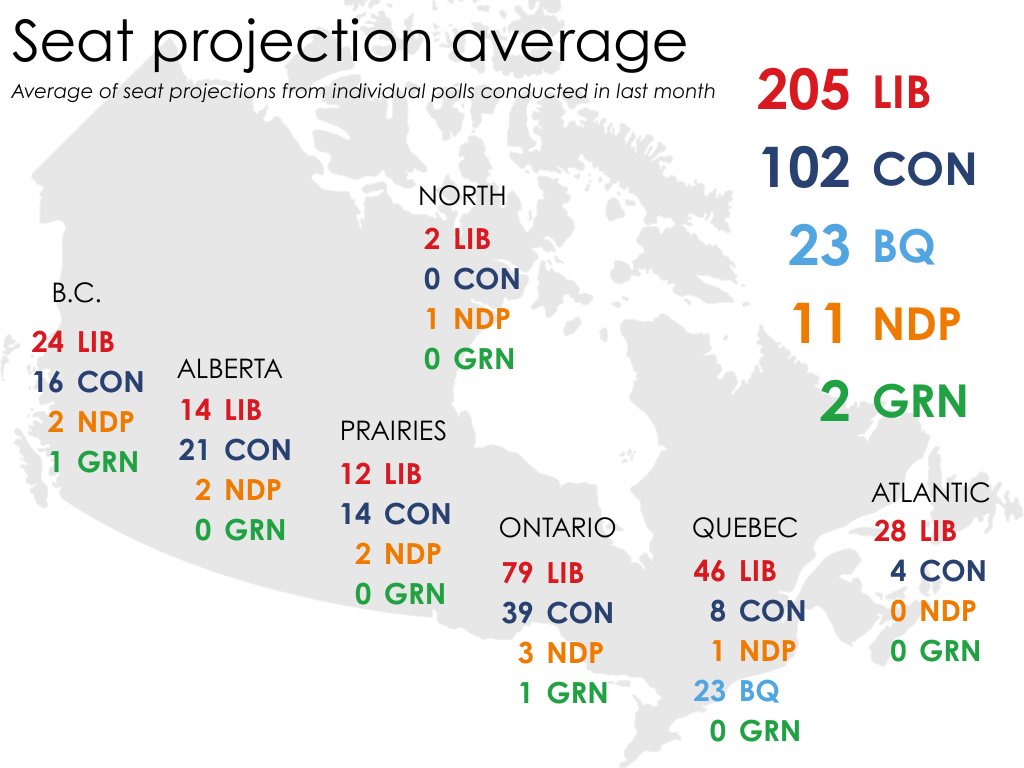 With these new polls out, the seat projection average has the Liberals leading with 205 seats, followed by the Conservatives at 102, the Bloc at 23 and the NDP at 11.