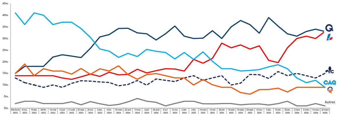 In other words, the CAQ first lost its nationalist vote to the PQ in 2023 and 2024 and then lost its federalist vote to the PLQ in 2025 and 2026. Throughout this time period, the Conservatives have hardly budged while QS has dropped a bit. It’s possible that QS has lost some of its federalist vote to the Liberals and some of its sovereignist vote to the PQ while the Conservatives have shaved off a bit of the CAQ’s more right-wing vote. But the biggest shifts have clearly been CAQ→PQ followed by the CAQ→PLQ that is happening now.