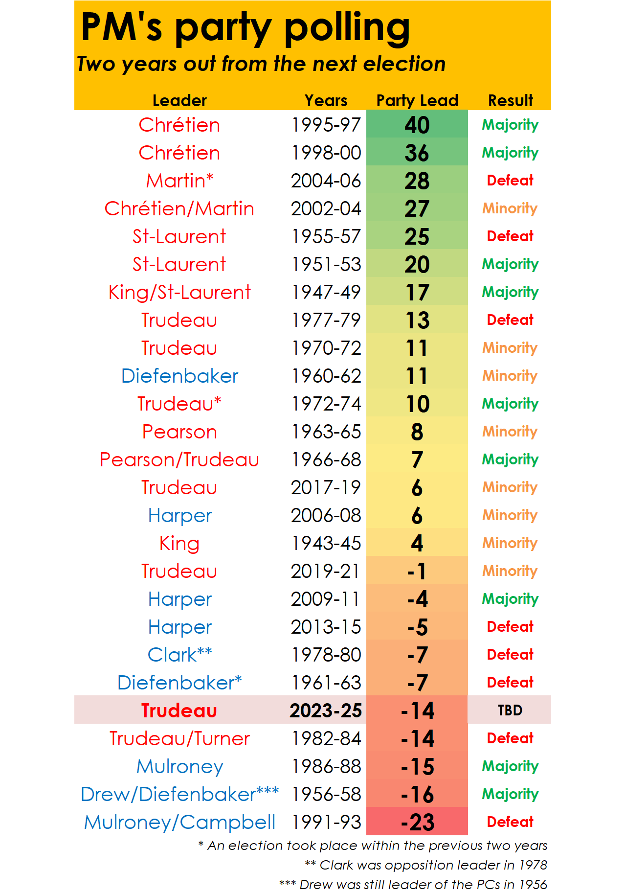 Since polling began in the 1940s, in only three other cases has the prime minister’s party trailed in the polls by larger margins than Justin Trudeau’s Liberals do today.